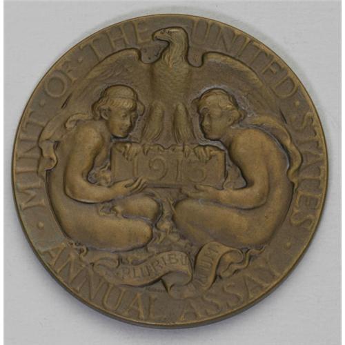 <B>1913 Assay Commission Medal. MS63 Uncertified.</B></I> Julian AC-57, R.5. Bronze, 44.1 mm., 611.1 grains. Four Assay Commission medals issued from 1910 through 1913 each had the identical obverse and reverse design, only with the dates changed. This example is a pleasing Mint State representative with olive-brown color.