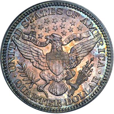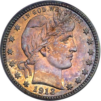 1913 Barber Quarter Dollar. PCGS graded Genuine Proof, questionable color. Our grade is Proof-64 with lovely light violet and natural golden colors with hints of iridescense. From an old time collection. Only 613 Proofs minted (PCGS # 5699) .