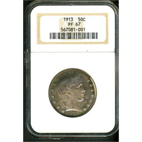 <b>1913 Barber Half Dollar. NGC graded Proof 67.</b> A supremely preserved specimen that offers a rich, deep toning that includes splashes of golden-russet, silvery, and steel-blue toning. The 1913 is one of the more readily identifiable scarce dates for Barber collectors. Mint States are rarely offered. Proofs, when they are offered, tend to be hairlined or cleaned; rarely are they naturally toned. The devices are lightly frosted but because of the cover of beautiful toning, this hides any significant cameo contrast on each side. The surfaces are for all intents and purposes flawless, while the devices were left intricately defined throughout once the dies impacted the surface of the planchet. If one turns this piece gently under a strong light, its outstanding features are more completely exposed. Exceptional quality from a mintage of just 627 Proofs. NGC Population: 12, with 4 higher.