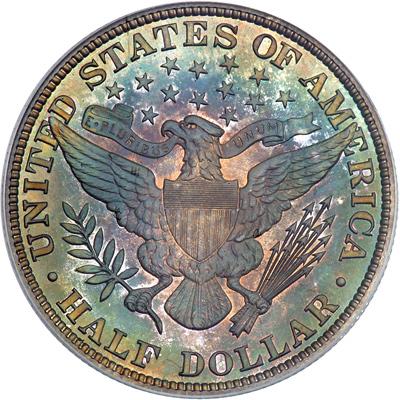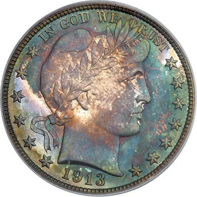 1913 Barber Half Dollar. PCGS graded Proof 67. Lovely rainbow toning. Only 627 Proofs issued. The Superb Gem offered in this lot is one of a baker's dozen 1913 Proofs with the coveted 67 designation! The reasons for this are plain to see. One, gorgeous iridescent toning spreading inwards from the borders, with each side nicely corresponding to the other. Two, a bold strike yields the definition on all design elements a coin of this caliber deserves. And three, faultless quality is seen on both sides, no marks, not spots, faultless. These attributes produce a level of eye appeal which seems impossible to top. Pop 13; none finer at PCGS (PCGS # 6560) .