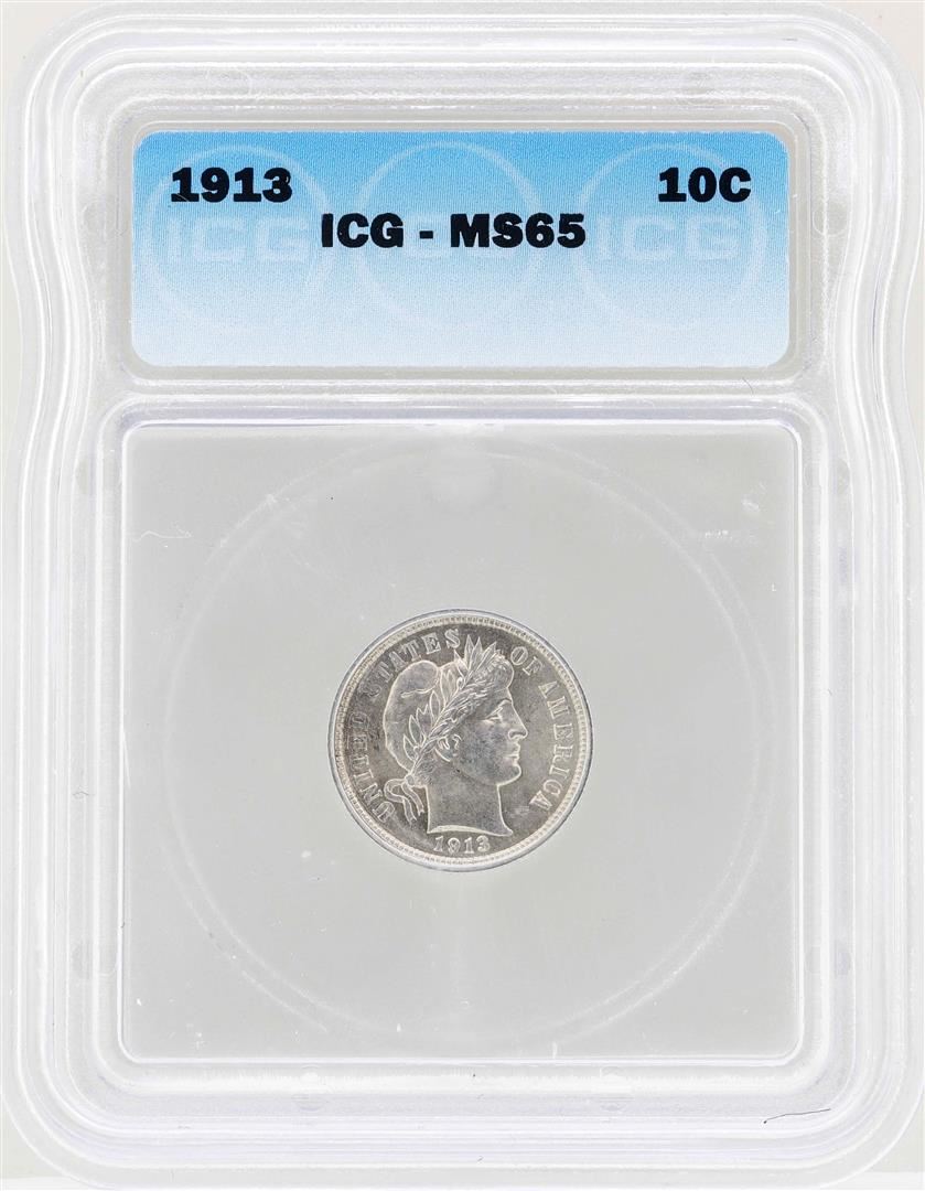 One 1913 Barber Dime Coin ICG MS65. ICG Certified.