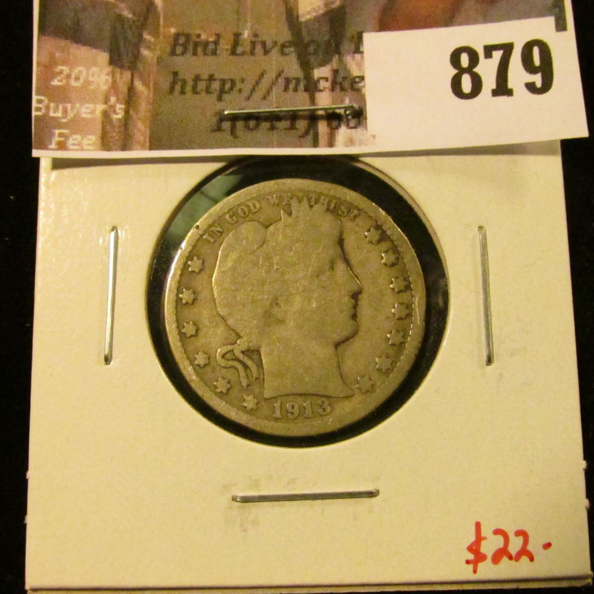 1913 Barber Quarter, G, low mintage (484,000) semi-key date (same mintage as a 1909-S VDB cent!) val