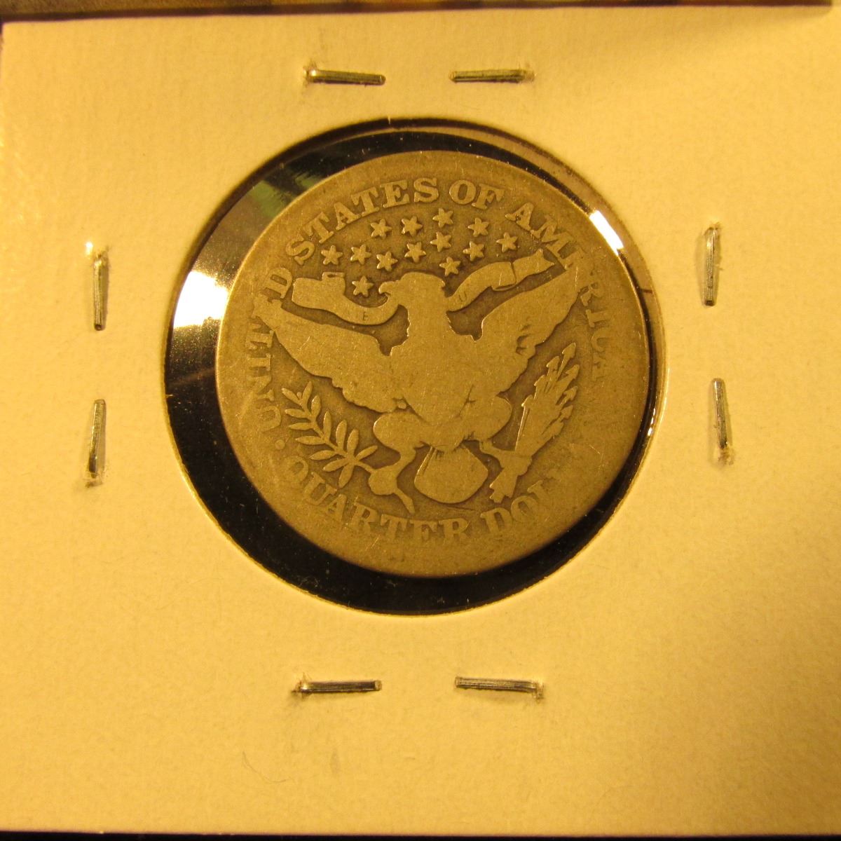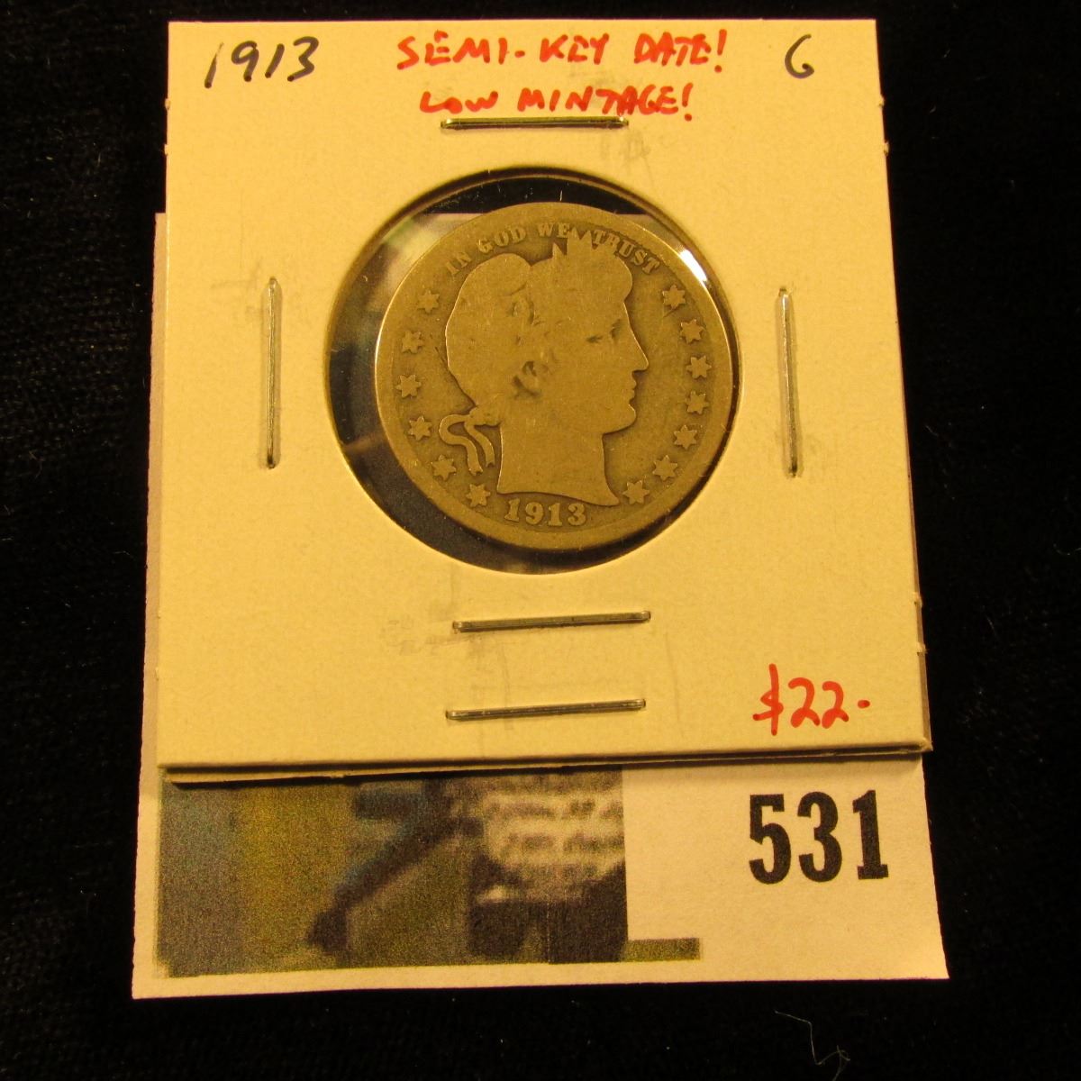1913 Barber Quarter, G, low mintage, semi-key date, value $22