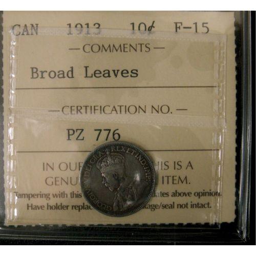 1913 Broad Leaves 10¢ ICCS F-15, a nice and p