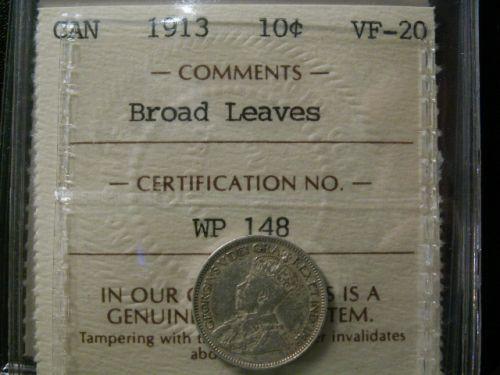 1913 Broad Leaves 10¢ ICCS VF20. Very lightly toned. Sharp with a couple of tiny scratches.