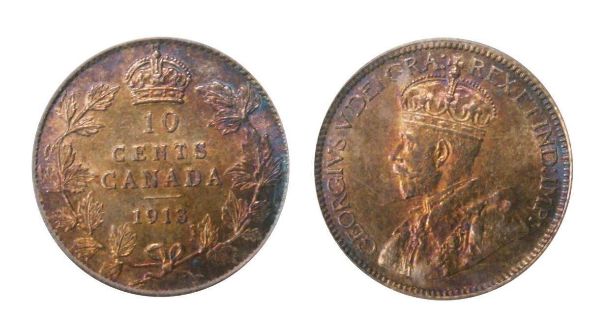 1913 "Broad leaves" 10¢ PCGS MS-63. ONE OF THE FINEST KNOWN! Superb toning over full underlying luster. Wow! An amazing example. Excellent strike with clean fields and lovely surfaces. The nicest example ever handled by TCNC. Expect strong bidding.