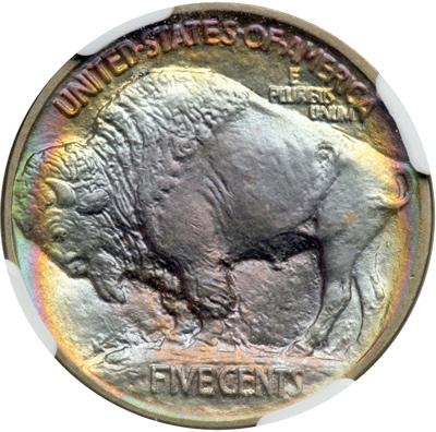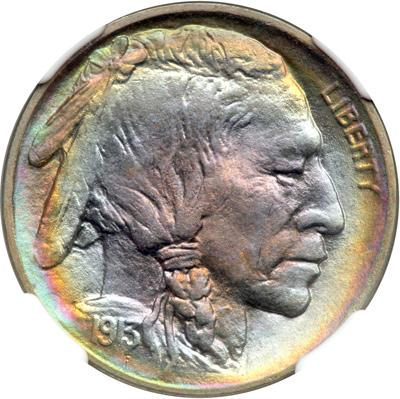 1913 Buffalo Nickel. Type 1. NGC graded MS-68. Star. Wonderful rainbow toning on both sides. Almost incredible light electric blue and magenta toning with some splashes of gold, over a highly lustrous surface. A more artistic example cannot be imagined. Although the 1913 Type I nickel is readily available in all grades, including choice Mint State, at the certified MS-68 level it becomes exceedingly rare indeed. As stated, the present piece is fantastic!