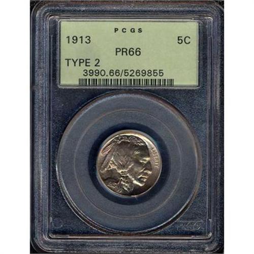 <b>1913 Buffalo Nickel. Type 2. PCGS graded Proof 66.</b> A lustrous example of this low mintage Proof date, delicately toned and nothing short of pristine throughout; excellent nickel-gold color. This is a well-struck example of the very scarce Type 2 Proof with bold details. It has no bothersome abrasions or spots or points of wear but on the contrary displays smooth satiny "matte" characteristics. Technically, these were made using a fine sandblasting process. Struck twice by the dies, all elements of the design show with razor-clarity.
