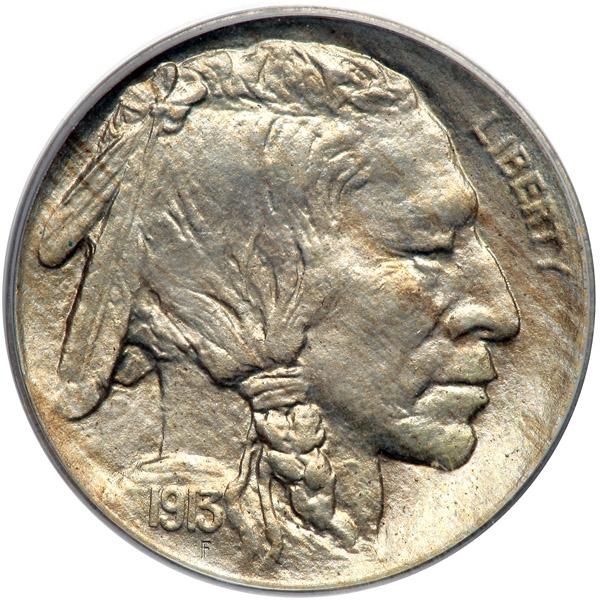 James Earle Fraser had made numerous studies of Native Americans before undertaking the task of creating an Indian head for the nickel. The obverse portrays a mature warrior facing right. His hair is braided in the style of the plains Indians with a ribbon securing the braid. Two feathers are affixed near the part of the hair, and a third one is only partly visible. The garment across his shoulder provides a foundation for the coin's date, and Fraser's initial letter 'F' appears below the date.