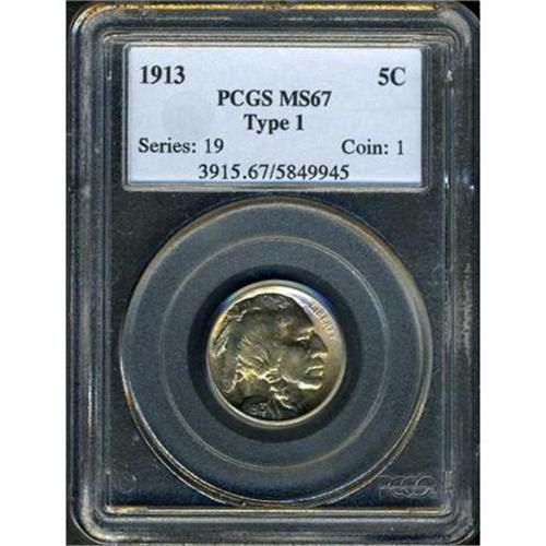 <b>1913 Buffalo Nickel. Type 1. PCGS graded MS67.</b> Lustrous, mint-frosty surfaces put on a show with their rich colors and gold-with-blue iridescence, the overall appearance greatly reinforced by cartwheel luster. Regarding this date, it is one of the most affordable years in the series, but rarely finds its way into a Mint State 67 grading holder. You can never go wrong than to begin a Buffalo nickel collection with this Type I gem <b>(PCGS # 3915)</b>