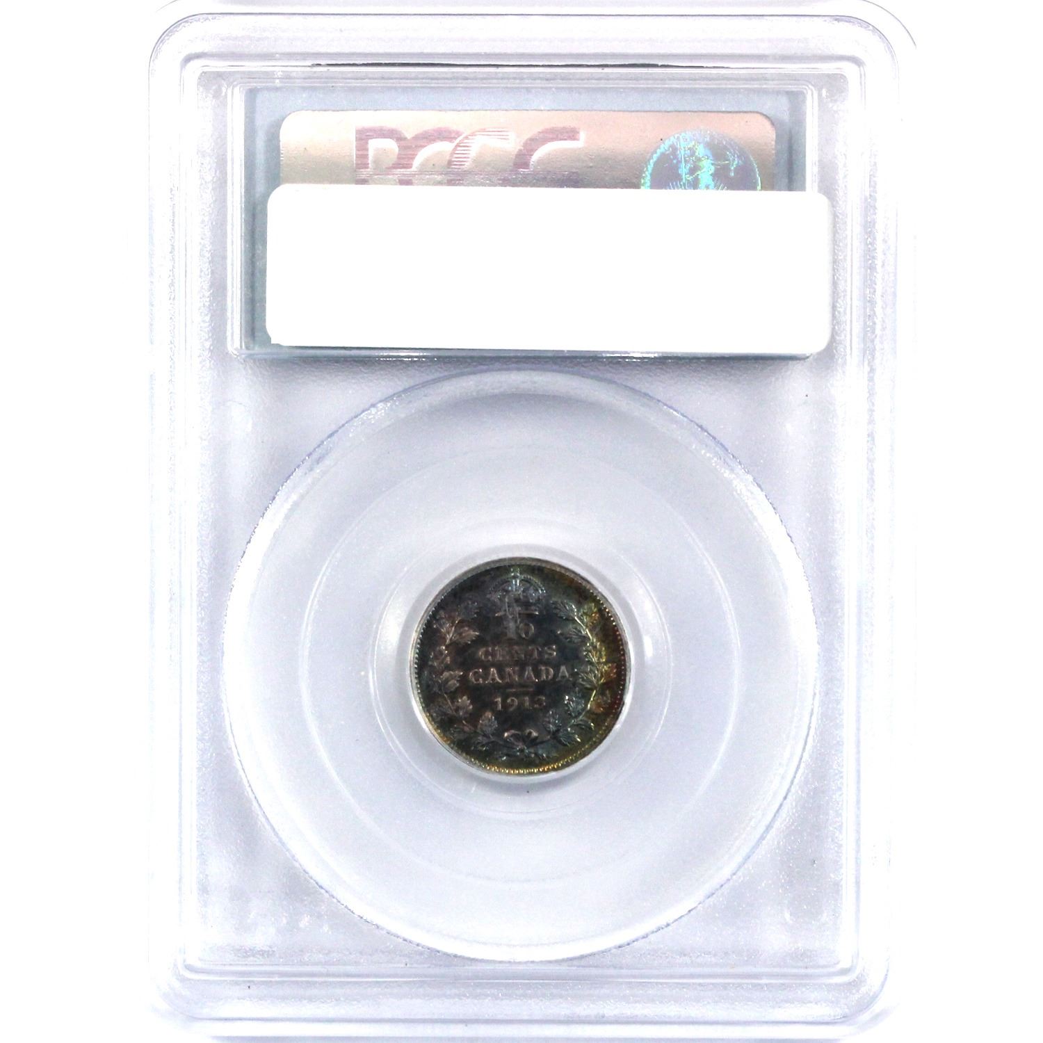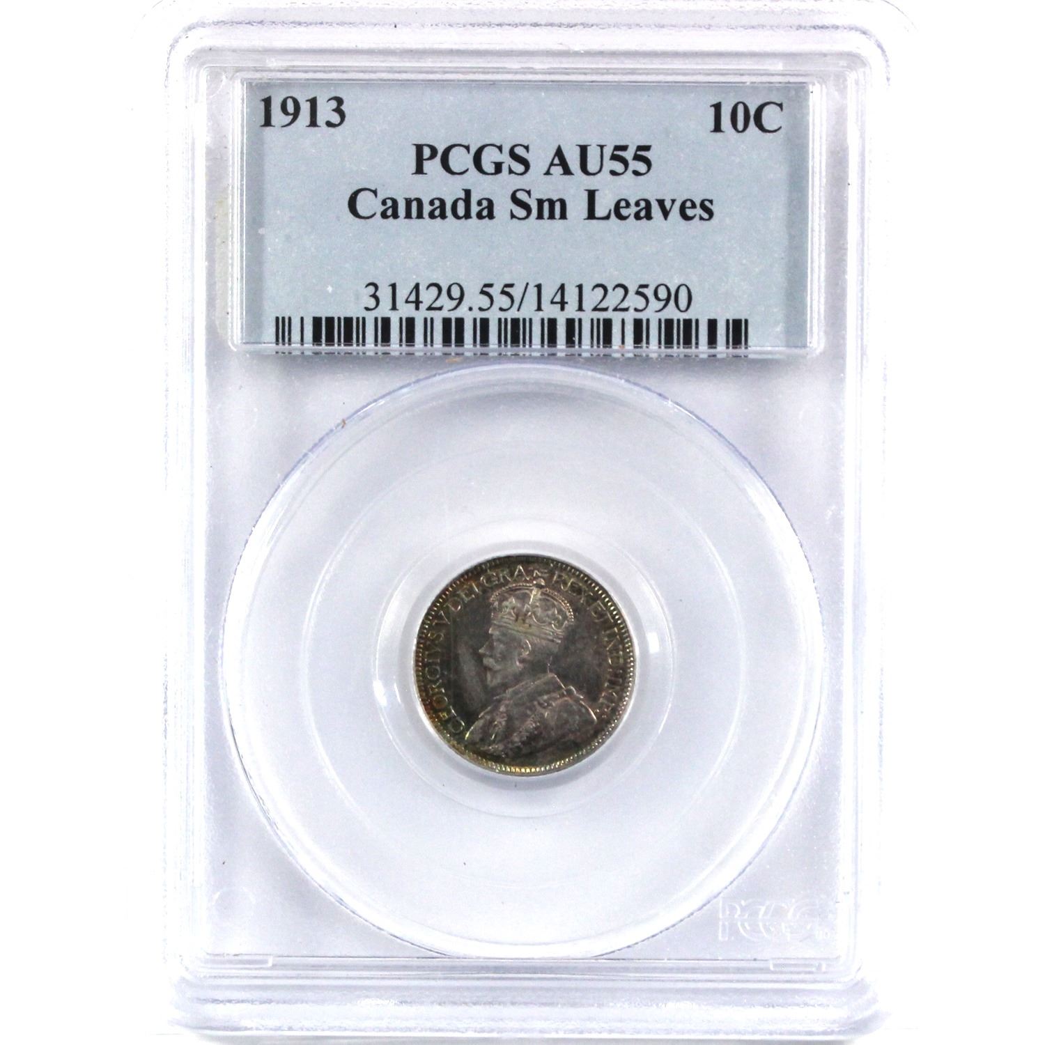 1913 Canada 10-cent Small Leaves PCGS Certified AU-55. Strong attractive rainbow toning mostly on reverse!
