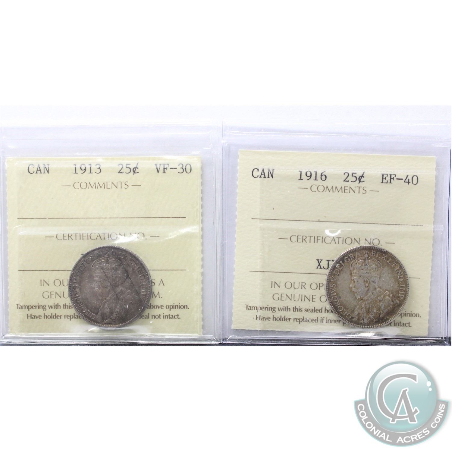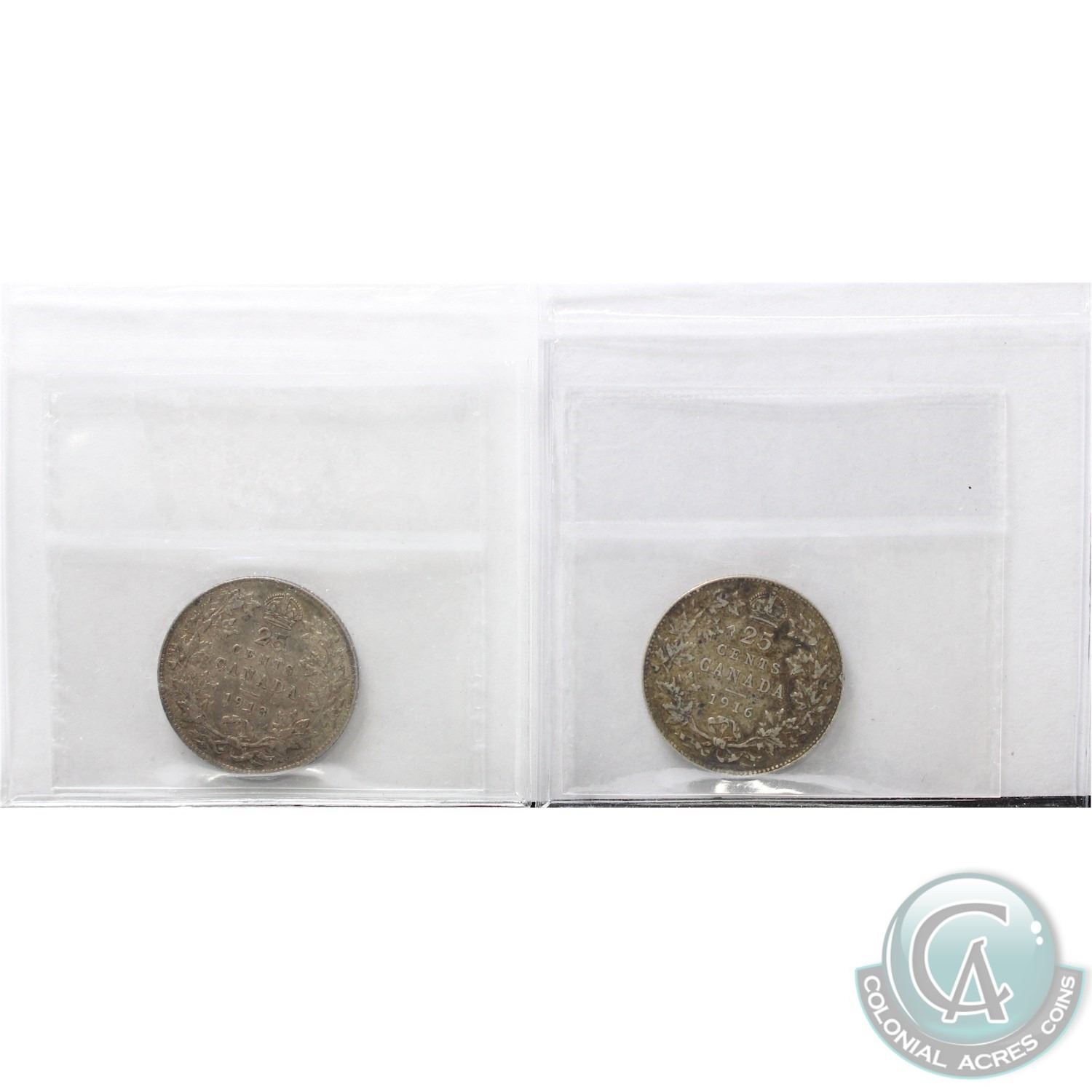 1913 Canada 25-cent ICCS Certified VF-30 & 1916 25-cent ICCS EF-40. 2pcs