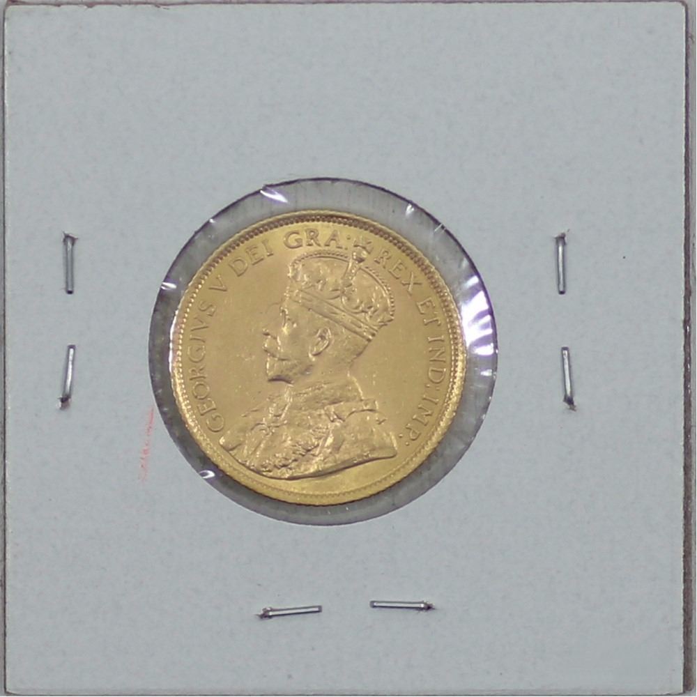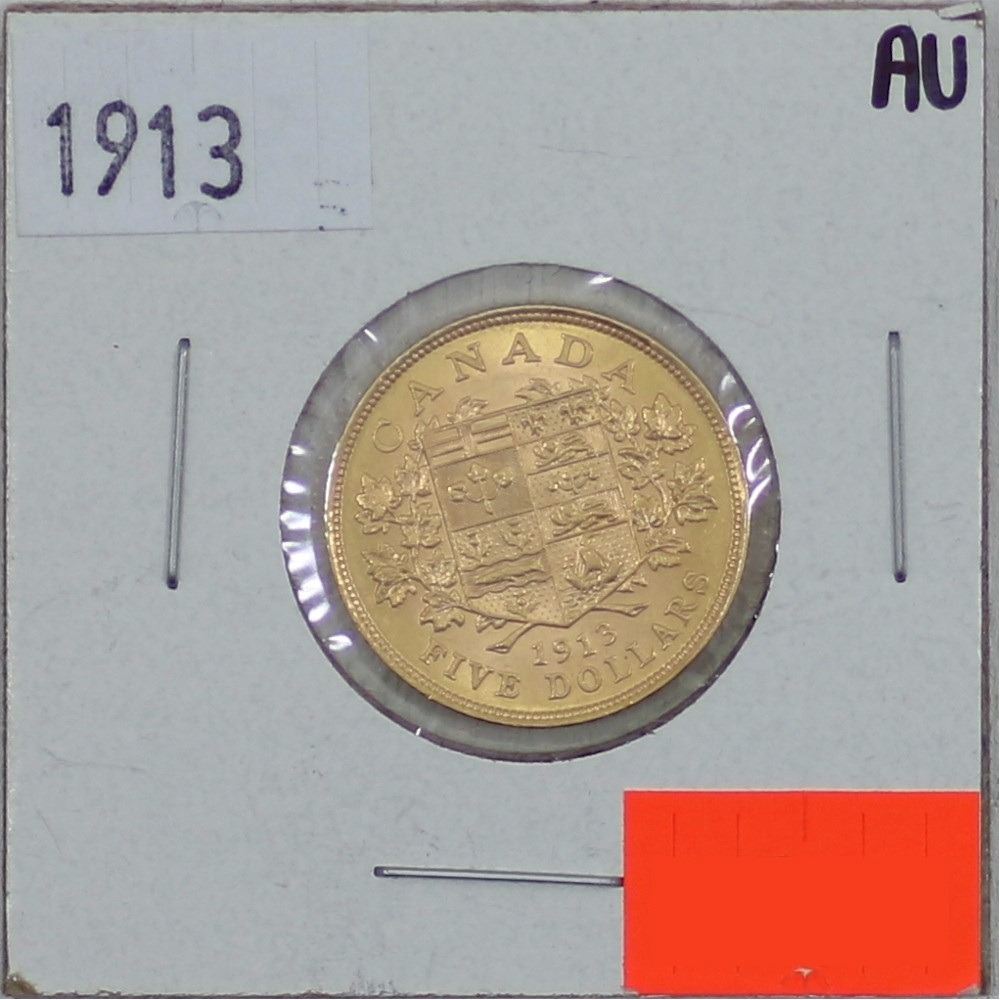 1913 Canada $5 Gold Coin in Almost Uncirculated + condition. This coin is .900 Fine and contains 0.242oz of pure Gold.