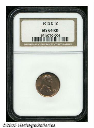 <B>1913-D<1C> MS64 Red NGC.</B></I> Well struck and lustrous, with very slightly marked lilac-red surfaces that have a few grade-limiting carbon spots in the left obverse field, and a couple of tiny contact marks on Lincoln's cheek, but are otherwise undisturbed. Population: 80 in 64 Red, 28 finer (4/05).
