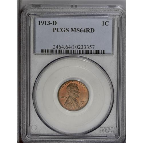 <B>1913-D<1C> MS64 Red PCGS.</B></I> Intricately detailed in all areas, the surfaces are cherry-red with just a hint of lilac on the obverse. A grade-limiting spot is located in the center of the obverse.<BR><I>From The Tigard Oregon Small Cent Collection.</B></I>