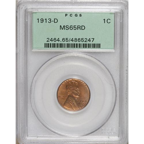 <B>1913-D 1C MS65 Red PCGS.</B></I> A popular early issue. The warm reddish-orange surfaces have magenta-violet accents and minimal carbon. Aside from slight softness at the top of the O in ONE, the clean devices are well-defined. PCGS has graded only eight finer Red examples (2/07).<BR><BR><b>Shipping:</b> Coins & Currency (<a target="_blank" href="http://www.heritageauctions.com/common/shipping.php">view shipping information</a>)