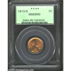 1913-D 1C MS65 Red PCGS. This reddish-orange Gem is fully lustrous with an overall bold strike. There are no singularly distracting bagmarks to report, but accuracy compels us to mention an obverse spot at the base of Lincoln's bust.From the St. Louis Collection. Important notice: We expect to be auctioning lots at the rate of 200-250 per hour. Sometimes eBay Premier live bid software cannot keep up with that pace, so we strongly recommend that you place a realistic proxy bid now as insurance to avoid disappointment. Also please note that all Heritage/CAA lots purchased through eBay Premier carry a 20% Buyer's Premium. Please make sure you read the Terms and Conditions.