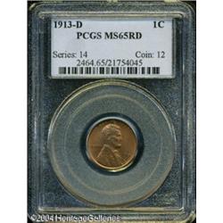 1913-D 1C MS65 Red PCGS. Well struck and satiny, t <B>1913-D 1C MS65 Red PCGS.</B></I> Well struck and satiny, this Gem is nearly free of contact marks, and only shows a small degree of carbon on the obverse. It is carefully preserved with nice coloration, as well. Population: 82 in 65, 7 finer (11/04). <BR><BR><B>Important notice:</B> Heritage usually auctions material at the rate of 200-250 lots per hour. On some occasions eBay Live bid software or the Internet may not be able to keep up with the pace of the auction. We recommend placing a realistic absentee bid now as insurance to avoid disappointment. Occasionally the auctioneer may eliminate or reject an eBay Live bid, and the auctioneer may also reopen a lot after the close of the eBay live bidding (usually because we missed an audience bid), and may reject your bid even if it shows you as the winning bidder. By bidding via eBay Live, you agree that Heritage may award the lot to another bidder at its sole discretion under the circumstances described above or any other reasonable circumstances. Since eBay bids are not shown to us until we open the lot on the floor, we treat those bids just like floor bids. In most cases the floor responds before the eBay bid is presented to us, due to Internet lag time, so for consistency we have made it a policy that floor bids are always considered first over tie eBay live bids. Also please note that all Heritage lots purchased through eBay Live carry a 20% Buyer's Premium. Please make sure you read the Terms and Conditions before you bid. This lot is being auctioned in conjunction with a live floor auction by Heritage Galleries & Auctioneers. All final auction and invoice information will be supplied by Heritage Galleries & Auctioneers, and all other information should be considered preliminary. Lot:5238