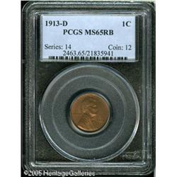 <B>1913-D 1C MS65 Red and Brown PCGS.</B></I> A well struck Gem, mostly dusky fire-red in color although subtle steel-blue hues are also present. An unmarked and shimmering example of this scarce early branch mint Cent. Lot:5409