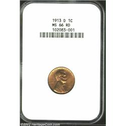 1913-D 1C MS66 Red NGC. It is a curious fact that most high grade survivors of this otherwise indifferently produced issue are sharply struck. On the other hand, locating a high grade (MS65 Red or finer) 1913-D Cent is not at all easy, and the present Gem must be considered one of the finest coins extant. As alluded to above, this premium quality representative is sharply struck throughout. Dominant orange-red color overlays both sides, neither of which reveals a single distracting abrasion or carbon fleck. Both major grading services report just nine coins at the MS66 Red level of preservation, and none have been certified finer (7/02).From the Francis Sullivan Collection. Important notice: We expect to be auctioning lots at the rate of 200-250 per hour. Sometimes eBay Premier live bid software cannot keep up with that pace, so we strongly recommend that you place a realistic proxy bid now as insurance to avoid disappointment. Also please note that all Heritage/CAA lots purchased through eBay Premier carry a 20% Buyer's Premium. Please make sure you read the Terms and Conditions.