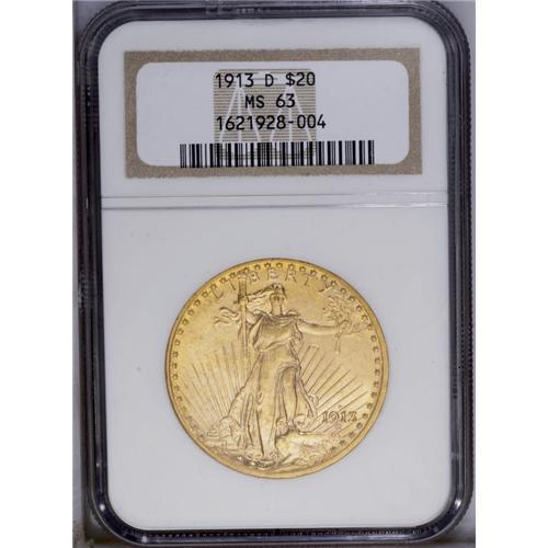 <B>1913-D $20 MS63 NGC.</B></I> This lustrous example offers lovely apricot-gold surfaces with reddish-gold highpoints and well struck details. Perusal with a glass reveals only a modicum of grade-consistent contact marks on this desirable specimen.