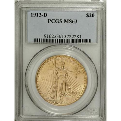 <B>1913-D $20 MS63 PCGS.</B></I> Booming luster illuminates this carefully preserved Saint-Gaudens twenty. Well struck aside from Liberty's nose, and a faint X on the chest may be as made.<BR><BR><B>Coin Engraver:</B> Augustus Saint-Gaudens<BR><BR><b>Shipping:</b> Coins & Currency (<a target="_blank" href="http://www.heritageauctions.com/common/shipping.php">view shipping information</a>)
