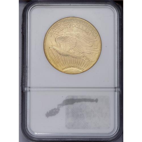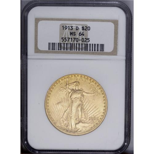 <B>1913-D<$20> MS64 NGC.</B></I> This lustrous apricot-gold representative has a clean reverse and only a single noteworthy obverse mark, on one of the left-side rays. The lowest mintage of the four Denver Mint issues from the teens.