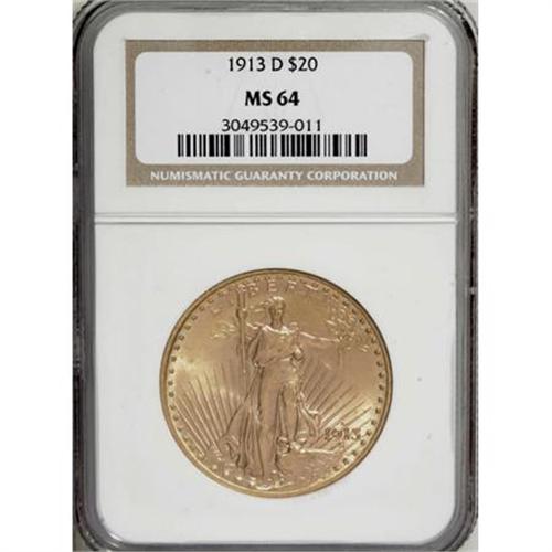 <B>1913-D $20 MS64 NGC.</B></I> The strongly lustrous butter-yellow surfaces of this D-mint double eagle offer strong eye appeal for the grade. Pleasingly detailed overall with a hint of aqua near the margins.<BR><BR><B>Coin Engraver:</B> Augustus Saint-Gaudens<BR><BR><b>Shipping:</b> Coins & Currency (<a target="_blank" href="http://www.heritageauctions.com/common/shipping.php">view shipping information</a>)