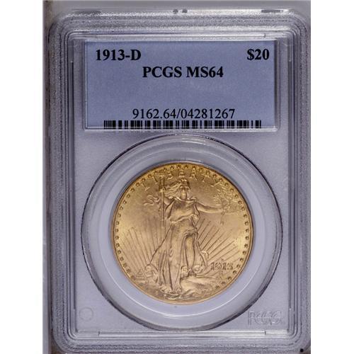 <B>1913-D<$20> MS64 PCGS.</B></I> Boldly struck with lovely, softly frosted luster and enticing pastel coloration on both sides. Scattered small marks define the grade of this attractive near-Gem. <BR><BR><B>Important