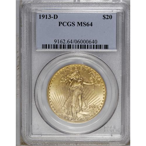 1913-D $20 MS64 PCGS. A Choice and highly lustrous pie