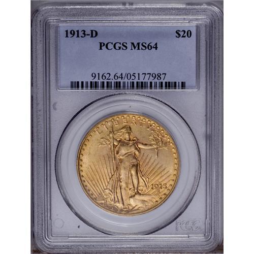 <B>1913-D<$20> MS64 PCGS.</B></I> A gorgeous near-Gem with golden-rose color and just a few light abrasions that prevent a higher grade. This issue makes a considerable jump in value at the next highest grade level.