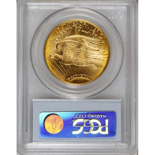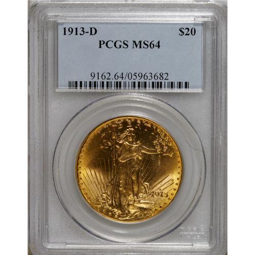 <B>1913-D $20 MS64 PCGS.</B></I> Bright yellow-gold and peach-gold luster generates considerable "flash" on this Denver issue twenty, complemented by sharply struck motifs. A few marks, especially on the reverse, limit the grade.<BR><BR><b>Shipping:</b> Coins & Currency (<a target="_blank" href="http://www.heritageauctions.com/common/shipping.php">view shipping information</a>)