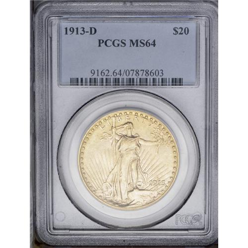 <B>1913-D<$20> MS64 PCGS.</B></I> Crisply struck, with strong definition on Liberty's face, fingers on the left (right facing) hand, and toes, and on the panes of the Capitol building. The grade is defined by minor marks on the obverse
