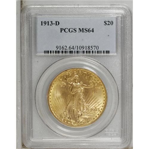 <B>1913-D $20 MS64 PCGS.</B></I> Mintmarked Saints are always more desirable especially when lustrous and golden.<BR><BR><b>Shipping:</b> Coin/Currency (<a target="_blank" href="http://www.heritageauctions.com/common/shipping.php">view shipping information</a>)