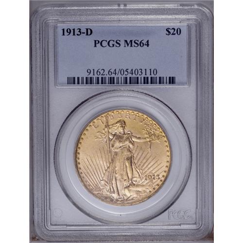 <B>1913-D<$20> MS64 PCGS.</B></I> Rich red-gold toning is the hallmark of this lovely piece. Bright satiny luster sparkles over the fine-grain surfaces, that show a few small abrasions on each side. Well struck except for Liberty's torch hand.