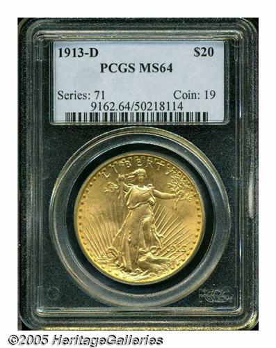 <B>1913-D<$20> MS64 PCGS.</B></I> This is a fully brilliant and highly lustrous example with bright yellow-gold color. Only 393,500 were coined, yet this is the highest double eagle mintage of the year, almost double the combined mintage at Philadelphia and San Francisco.