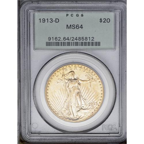 <B>1913-D<$20> MS64 PCGS.</B></I> This issue is usually well produced, and so it is with the present example. The delectable copper-gold surfaces show some prooflikeness and brilliant luster, with few distracting abrasions. Considerably more difficult at the Gem level. Certified in a green label holder.