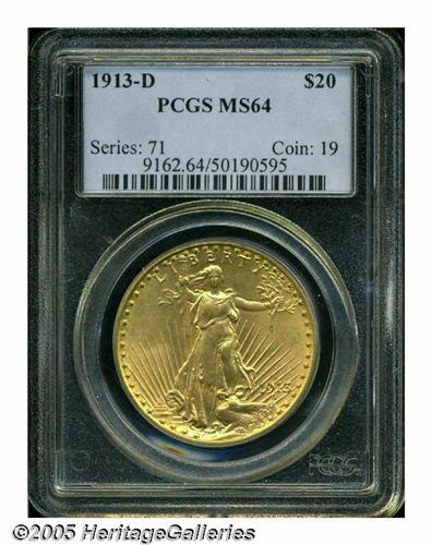<B>1913-D<$20> MS64 PCGS.</B></I> Well struck with distinctly matte-like field textures and lovely peach and orange-gold toning. This carefully preserved near-Gem reveals a few minor contact marks on obverse and reverse alike, preventing the Gem grade assessment from PCGS.