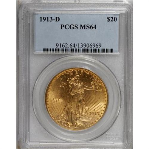 <B>1913-D $20 MS64 PCGS.</B></I> Soft luster enhances the lemon-gold and sun-gold of the minimally marked surfaces. A pleasingly detailed example of this D-mint double eagle issue, one of only 393,500 pieces struck.<BR><BR><B>Coin Engraver:</B> Augustus Saint-Gaudens<BR><BR><b>Shipping:</b> Coins & Currency (<a target="_blank" href="http://www.heritageauctions.com/common/shipping.php">view shipping information</a>)