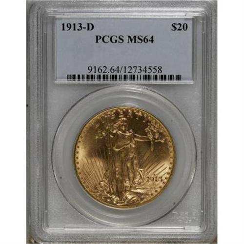 <B>1913-D $20 MS64 PCGS.</B></I> Subtle green-gold shadings characterize this well struck Denver double eagle. Choice with only a handful of small flaws present on the figure of Liberty and in the nearby fields.<BR><BR><B>Coin Engraver:</B> Augustus Saint-Gaudens<BR><BR><b>Shipping:</b> Coins & Currency (<a target="_blank" href="http://www.heritageauctions.com/common/shipping.php">view shipping information</a>)