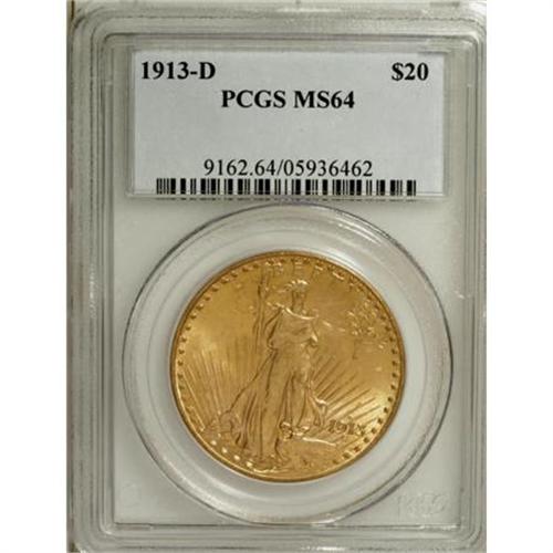 <B>1913-D $20 MS64 PCGS.</B></I> The fields have lovely honey-gold color with lighter yellow on the devices. Both sides have a few tiny surface marks that are expected for the grade. Well struck throughout.<BR><BR><B>Coin Engraver:</B> Augustus Saint-Gaudens<BR><BR><b>Shipping:</b> Coins & Currency (<a target="_blank" href="http://www.heritageauctions.com/common/shipping.php">view shipping information</a>)
