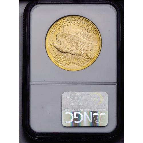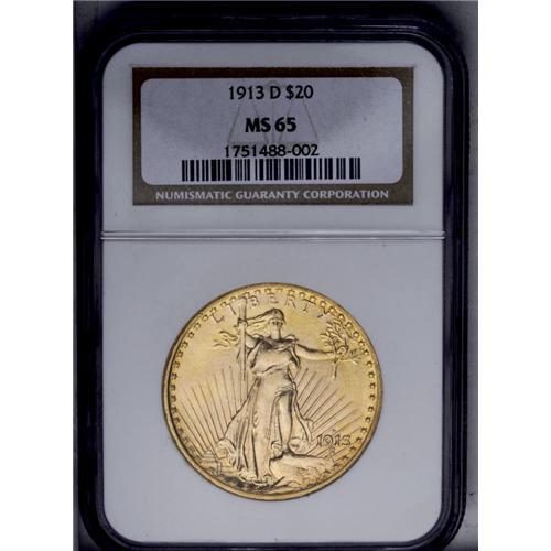 <B>1913-D<$20> MS65 NGC.</B></I> In <I>A Guidebook of Double Eagle Gold Coins,</B></I> published in 2004, Dave Bowers noted: "The 1913-D is another Saint-Gaudens double eagle that you can acquire without any difficulty as you build a set of the early series. Mint State coins are plentiful, although at the MS-65 level they become rare." This is an attractive example of one of these rare Gem quality coins with sharp design details and brilliant yellow-gold luster. The surfaces have a soft, frosty texture. A few scattered marks can be seen on each side, consistent with the grade. NGC has only certified six finer examples of this date (6/06).