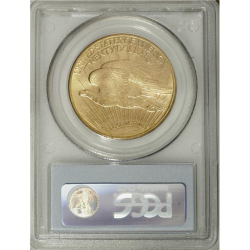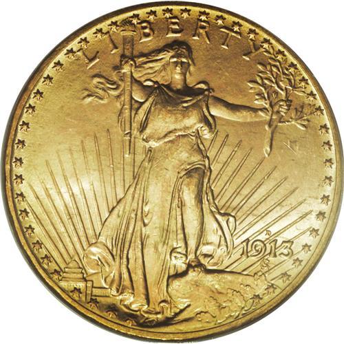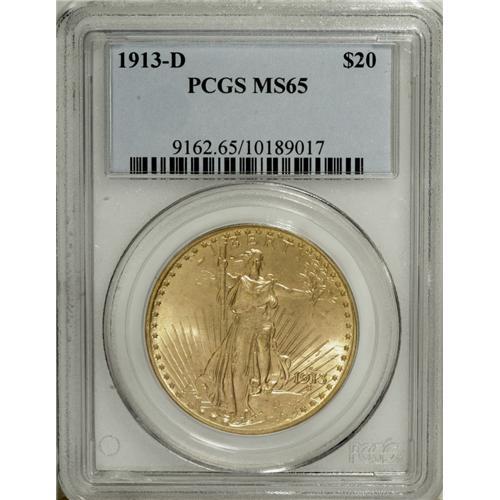 <B>1913-D $20 MS65 PCGS.</B></I> An early mintmarked issue that is available until one reaches the Gem level, and even then nice pieces such as the present piece occasionally appear. Apricot-gold surfaces are frosty and unabraded, with radiant luster and few mentionable contact marks. Well struck and delightful. PCGS has certified three coins finer (12/06).<BR><BR><b>Shipping:</b> Coin/Currency (<a target="_blank" href="http://www.heritageauctions.com/common/shipping.php">view shipping information</a>)