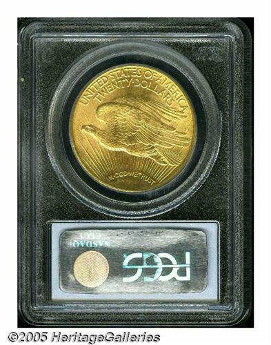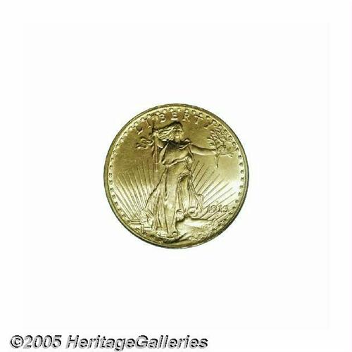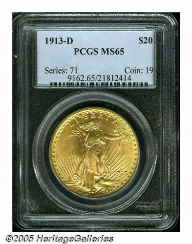 <B>1913-D<$20> MS65 PCGS.</B></I> An uncommonly clean coin for the issue, both sides are free of any serious detractions. The richly frosted surfaces glow with cartwheel effects. Remarkably well impressed for a Saint-Gaudens Double Eagle, this coin belongs in a high grade collection. Population: 134 in 65, 2 finer (6/05).