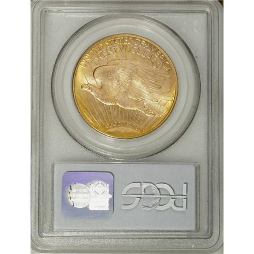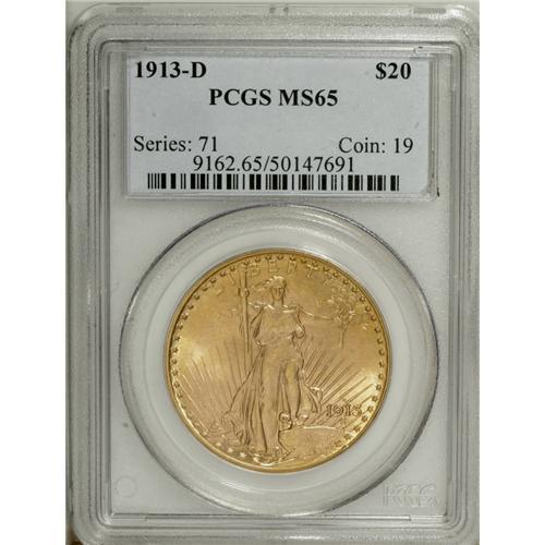 <B>1913-D $20 MS65 PCGS.</B></I> Highly lustrous with orange at the rims of this otherwise yellow-gold example. The detail is more than adequate, and the fields are clean overall. An interesting but small rim cud is noted between 4 and 5 o'clock on the obverse. PCGS has graded just three pieces finer (12/06).<BR><BR><b>Shipping:</b> Coin/Currency (<a target="_blank" href="http://www.heritageauctions.com/common/shipping.php">view shipping information</a>)
