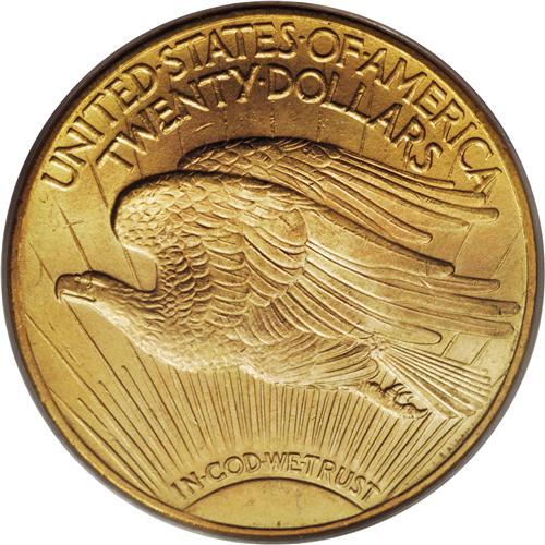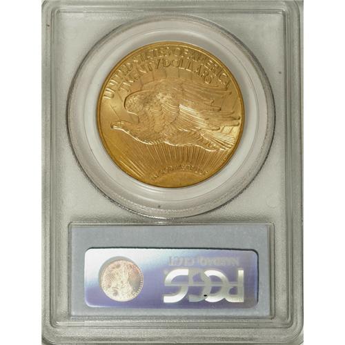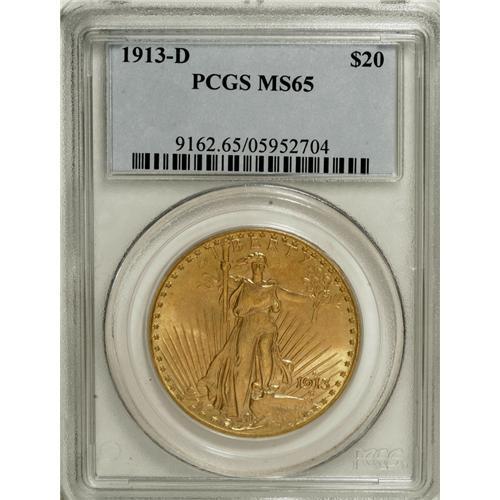 <B>1913-D $20 MS65 PCGS.</B></I> Most examples of the 1913-D apparently survived in European or South American bank vaults, and have trickled back to the U.S. over the past few decades. Large numbers are available through MS64, but the population takes a precipitous drop in MS65. Green-gold patina rests on sparkling luster, and a well executed strike left bold definition on the design elements. A handful of marks do not disturb.<BR><BR><b>Shipping:</b> Coins & Currency (<a target="_blank" href="http://www.heritageauctions.com/common/shipping.php">view shipping information</a>)