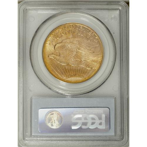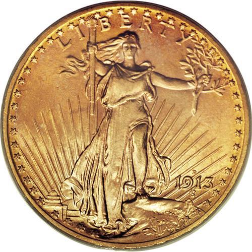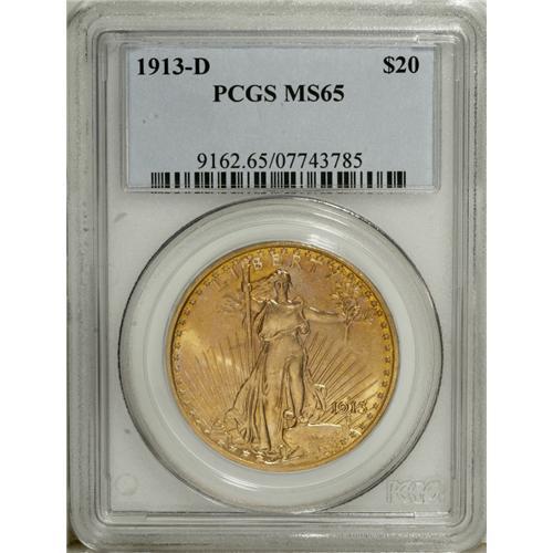 <B>1913-D $20 MS65 PCGS.</B></I> The 1913-D twenty, with a mintage of 393,500 pieces, can be acquired in most grades without too much difficulty. Mint State coins are plentiful, especially through the near-Gem grade level. MS65 examples are somewhat scarce, but available with patience and searching. Specimens finer than MS65 are far and few between, with a mere 10 pieces certified by PCGS and NGC combined. The current Gem exhibits excellent striking conditions and pretty orange-gold patina imbued with occasional speckles of sky-blue. The finish has a satin-like effect and is devoid of significant marks. A truly gorgeous Gem that will please the connoisseur of Saint-Gaudens coinage.<BR><I>From The Kutasi Collection.</B></I><BR><BR><b>Shipping:</b> Coin/Currency (<a target="_blank" href="http://www.heritageauctions.com/common/shipping.php">view shipping information</a>)