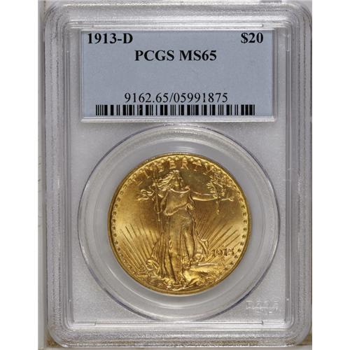 <B>1913-D $20 MS65 PCGS.</B></I> This is a gorgeous double eagle that is a contender for the most important collections. Currently (12/06), PCGS has only graded three pieces finer. Fully brilliant and highly lustrous surfaces have attractively blended rose and olive color. The 1913-D double eagle is the most plentiful issue of the year, as both the Philadelphia and San Francisco issues are important condition rarities.<BR><BR><b>Shipping:</b> Coins & Currency (<a target="_blank" href="http://www.heritageauctions.com/common/shipping.php">view shipping information</a>)
