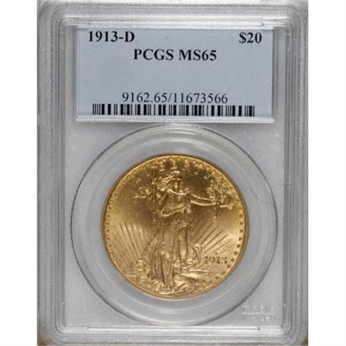 <B>1913-D $20 MS65 PCGS.</B></I> Solid detail and delightful wheat-gold color characterize this attractive Denver double eagle. The luster is pleasing, and marks are few. Though the 1913-D is the most available of the double eagles of 1913, with nearly 400,000 pieces struck, finding an attractive Gem can be a challenge, and anything finer is exceedingly elusive; PCGS has graded only three pieces finer (5/07).<BR><BR><b>Shipping:</b> Coins & Currency (<a target="_blank" href="http://www.heritageauctions.com/common/shipping.php">view shipping information</a>)