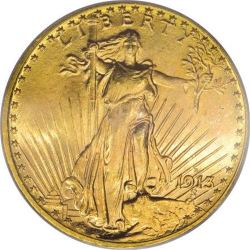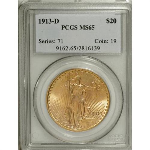 <B>1913-D $20 MS65 PCGS.</B></I> Most examples of the 1913-D double eagle survived in European or South American bank vaults before returning to the States over the past four decades. MS63 and MS64 coins are sufficiently available, but the number of Gems drops dramatically (Jeff Garrett and Ron Guth, 2006). Blazing luster envelops this MS65 specimen, and apricot-gold color graces both sides. Sharply struck, with just a few minor marks that likely preclude an even higher grade.<I><BR>From The Silver Fox Collection.</B></I><BR><BR><b>Shipping:</b> Coins & Currency (<a target="_blank" href="http://www.heritageauctions.com/common/shipping.php">view shipping information</a>)